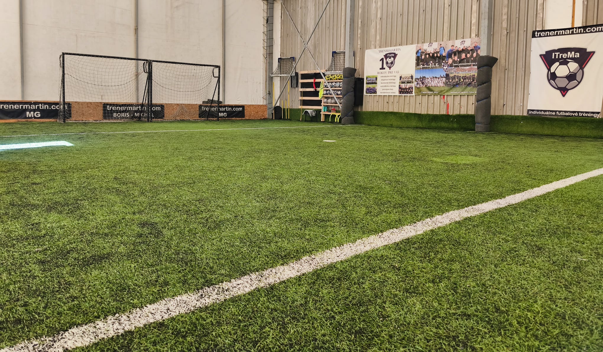 Ponúkame na prenájom tréningovú halu s umelou trávou vo veľkosti 18m x 12m so 6 bránkami a tréningovými pomôckami! Šatňa so sociánymi zariadením samozrejme k dispozícií.